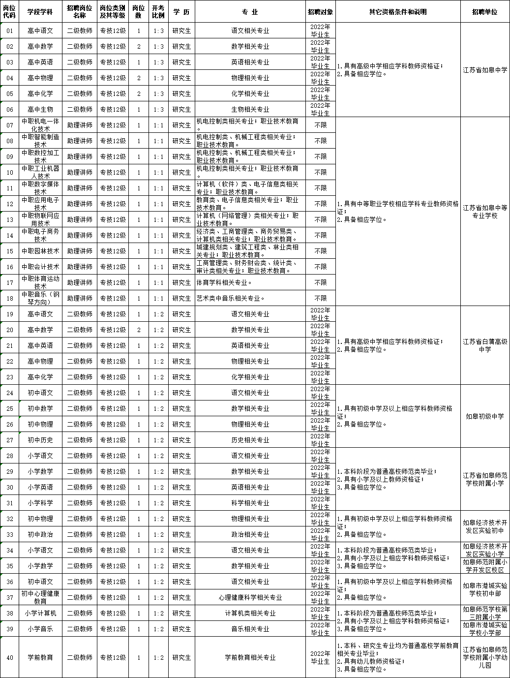 01-06崗位的招聘工作由江蘇省如皋中學(xué)負(fù)責(zé)組織實(shí)施,07-18崗位的招聘工作由江蘇省如皋中等專業(yè)學(xué)校負(fù)責(zé)組織實(shí)施,19-40崗位的招聘工作由如皋市教育局牽頭招聘單位共同組織實(shí)施。